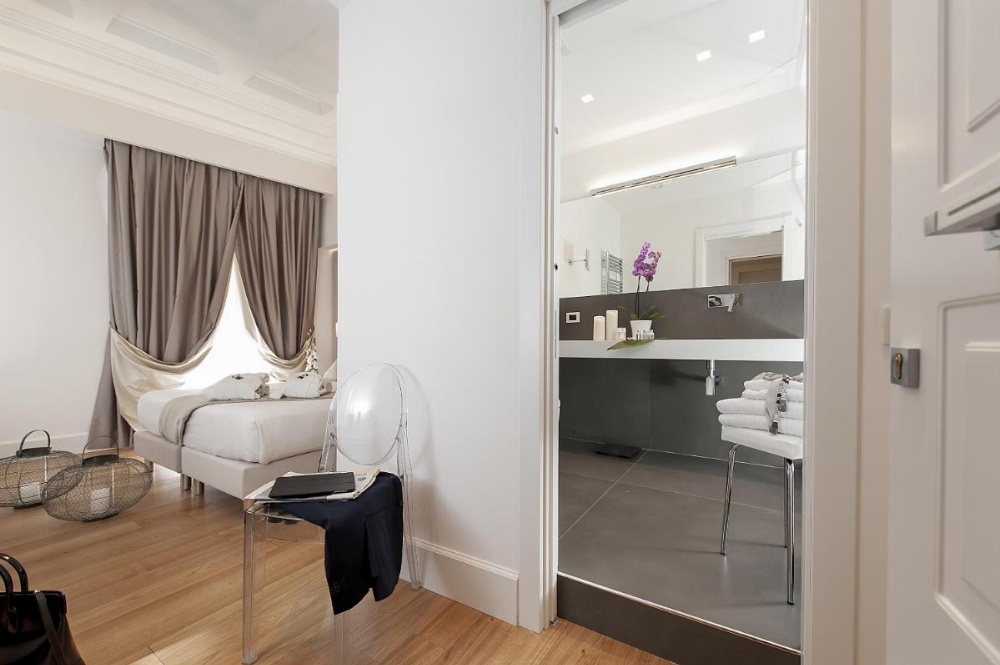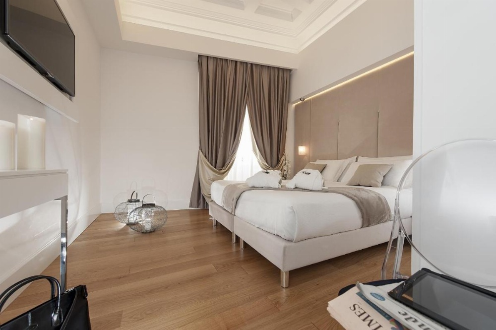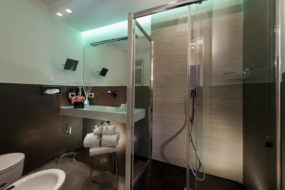 Features air conditioning, a flat-screen TV with Sky channels, and work desk. Bathroom includes bathrobes and slippers.